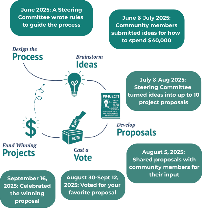 Based on community feedback submitted through the Participatory Budgeting Idea Form (accepted through July 11, 2025), the Steering Committee reviewed every idea and narrowed them down to eight. These ideas were developed into draft proposals for real, concrete projects. The ballot was finalized in mid-August, and voting took place from August 30 to September 12.