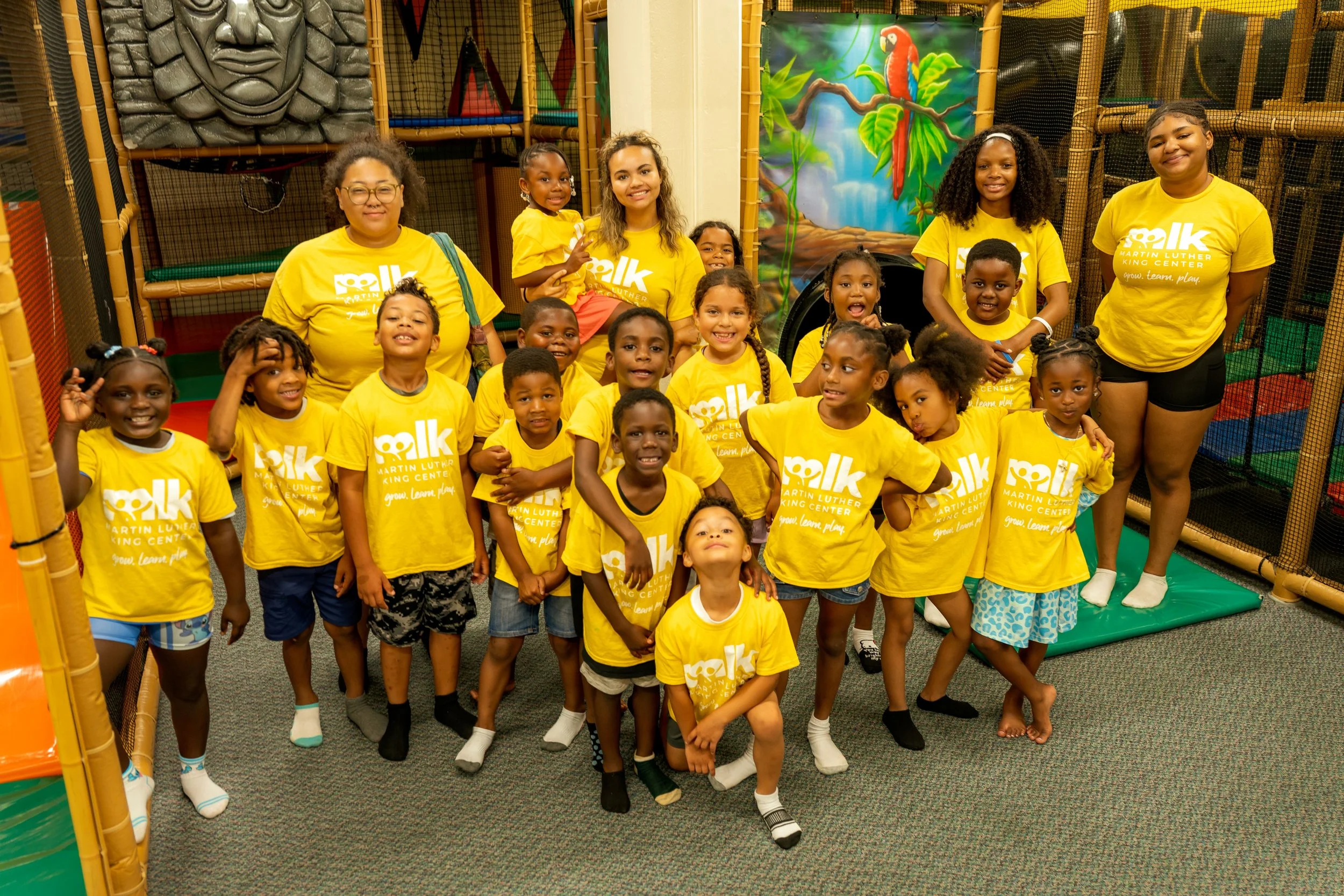 Two smiling girls wearing orange Martin Luther King Center t-shirts, posing in front of a colorful mural with words like "programs" and "change the world."